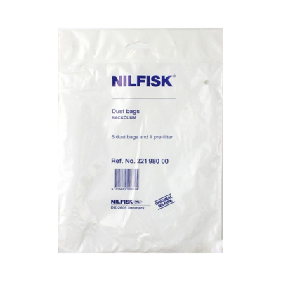 These genuine Nilfisk vacuum bags are designed specifically for the Backuum vacuum cleaner. Each pack includes five high-quality bags along with one prefilter, ensuring optimal performance and easy replacement.